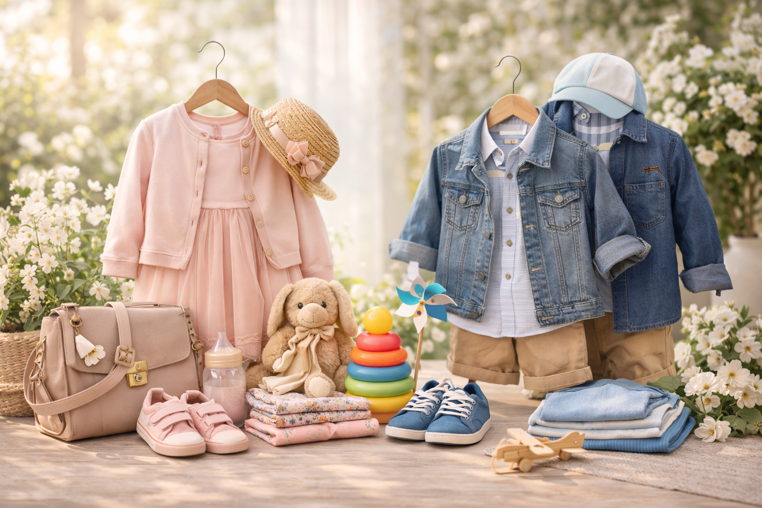 Große Auswahl an Kinderkleidung, Erwachsenenkleidung, Spielzeugen und Familienzubehör.
